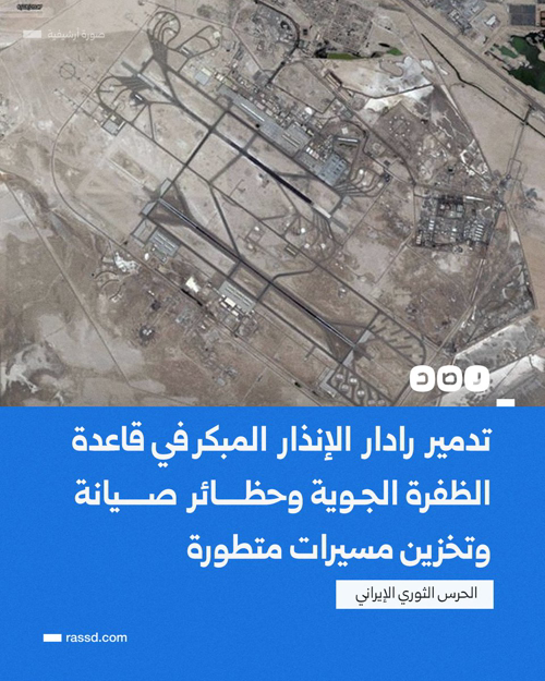 @RassdNewsN · 5h تغطية صحفية | الحرس الثوري الإيراني يعلن تدمير رادار الإنذار المبكر في قاعدة الظفرة الجوية وحظائر صيانة وتخزين الطائرات المسيّرة المتطورة من طراز MQ-9 وطائرة التجسس الأميركية U-2