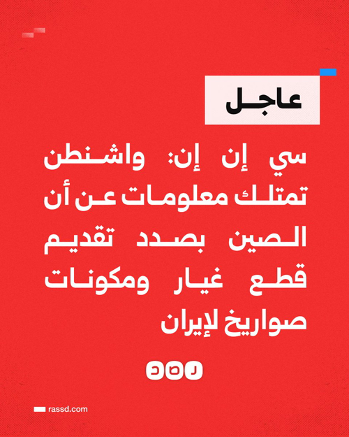 @RassdNewsN · 6h سي إن إن تنقل عن مصادر بأن واشنطن تملك معلومات تشير إلى أن الصين بصدد تقديم قطع غيار ومكونات صواريخ لإيران