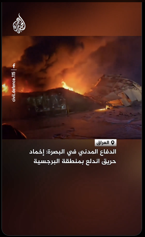 قناة الجزيرة @AJArabic الدفاع المدني في البصرة ينشر مشاهد لإخماد حريق اندلع بمنطقة البرجسية في محافظة البصرة العراقية. وكانت وكالة رويترز قد نقلت عن مصادر بأن حريقا اندلع بمكاتب ومستودعات شركتي هاليبرتون وكي.بي.آر الأمريكيتين عقب هجوم بطائرة مسيرة. #فيديو https://x.com/AJArabic/status/2030119964892409902 |