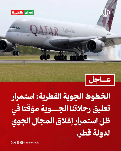 @iraninarabic_ir الخطوط الجوية القطرية: استمرار تعليق رحلاتنا الجوية مؤقتا في ظل استمرار إغلاق المجال الجوي لدولة قطر.