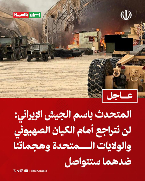 @iraninarabic_ir · 4h المتحدث باسم الجيش الإيراني: لن نتراجع أمام الكيان الصهيوني والولايات المتحدة وهجماتنا ضدهما ستتواصل.