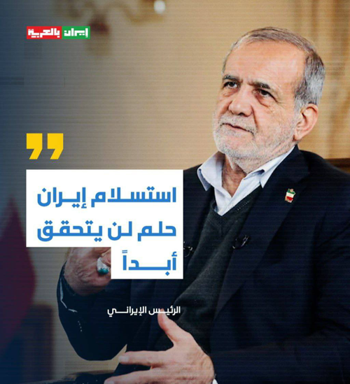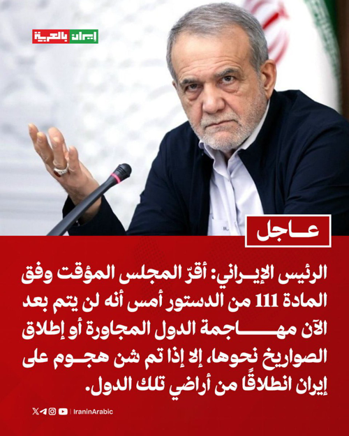 @iraninarabic_ir · 5h الرئيس الإيراني مسعود بزشكيان: أقرّ المجلس المؤقت وفق المادة 111 من الدستور أمس أنه لن يتم بعد الآن مهاجمة الدول المجاورة أو إطلاق الصواريخ نحوها، إلا إذا تم شن هجوم على إيران انطلاقًا من أراضي تلك الدول.