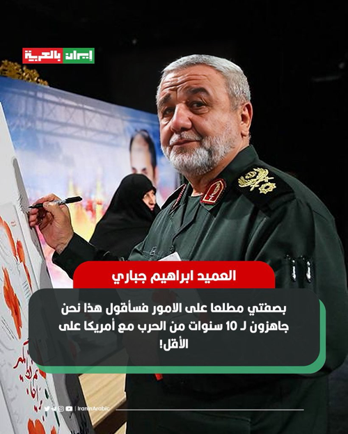 @iraninarabic_ir · 4h العميد ابراهيم جباري مستشار قائد حرس الثورة الإسلامية: بصفتي مطلعا على الامور فسأقول هذا، نحن جاهزون لـ 10 سنوات من الحرب مع أمريكا على الأقل!