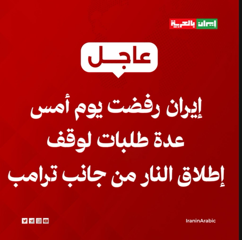@iraninarabic_ir · 6h مصدر مطلع : إيران رفضت يوم أمس عدة طلبات لوقف إطلاق النار من جانب ترامب