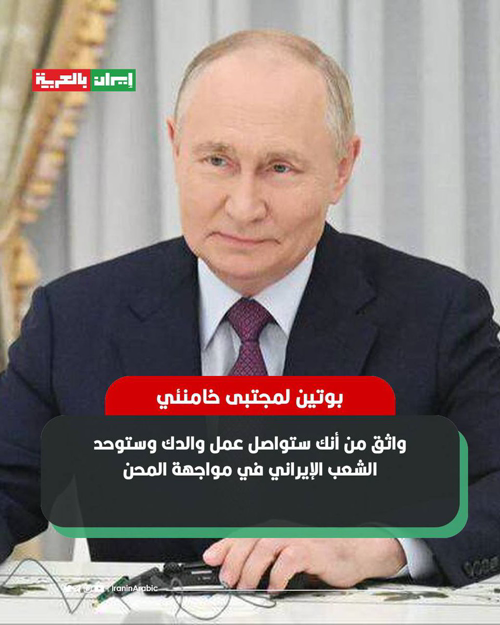 @iraninarabic_ir · 9h الرئيس الروسي فلاديمير بوتين خلال تهنئته للسيد مجتبى خامنئي: واثق أنك ستواصل عمل والدك بشرف وستوحد الشعب الإيراني في مواجهة المحن.