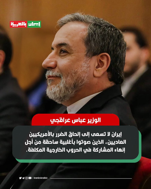 إيران بالعربية | عاجل @IranArabic_ir وزير الخارجية الايرانية السيد عباس عراقجي: إيران لا تسعى إلى إلحاق الضرر بالأمريكيين العاديين، الذين صوتوا بأغلبية ساحقة من أجل إنهاء المشاركة في الحروب الخارجية المكلفة. وتتحمل إسرائيل وعملاؤها المخدوعون في واشنطن مسؤولية ارتفاع أسعار الغاز، وزيادة تكلفة الرهون العقارية، والتأثير الكبير على حسابات التقاعد.