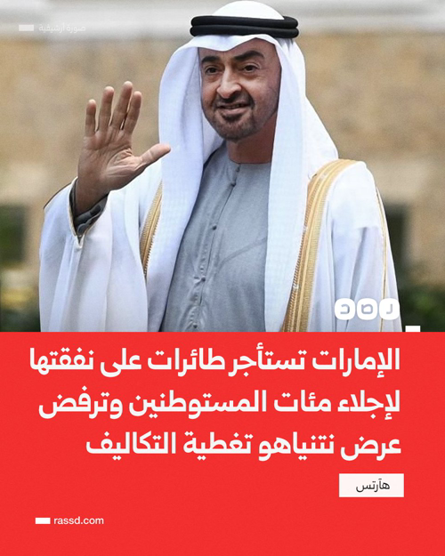 @RassdNewsN الإمارات تستأجر ثلاث طائرات على نفقتها الخاصة، لإجلاء 700 مستوطن إلى مطار بن جوريون في الأراضي المحتلة وأثينا، بعد عرض نتنياهو تمويل الرحلات وإصرار ابن زايد على تغطية التكاليف ووفق التقديرات كان نحو 14 ألف مستوطن موجودين في الإمارات مع بداية الحرب، بقي منهم نحو 4 آلاف وهم بصدد الإجلاء (هآرتس)
