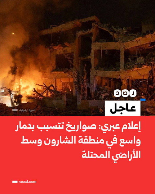 @RassdNewsN · 47m تغطية صحفية| إعلام عبري: صواريخ تتسبب بدمار واسع في منطقة الشارون وسط الأراضي المحتلة، وصفارات الإنذار تدوي في مناطق واسعة شمال الأراضي المحتلة، وخليج حيفا ، والجولان