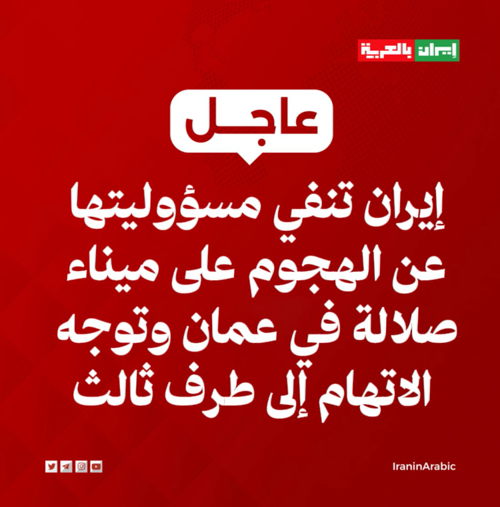 @IranArabic_ir · 3h إيران تنفي مسؤوليتها عن الهجوم على ميناء صلالة في عمان وتوجه الاتهام إلى طرف ثالث