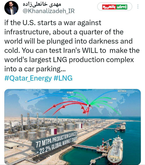 @iraninarabic_ir · 8h خان علي زاده، الخبير في الشؤون الدولية: إذا شنت الولايات المتحدة حربًا ضد البنى التحتية، فسيغرق نحو ربع العالم في الظلام والبرد. يمكنكم اختبار إرادة إيران لتحويل أكبر مجمع لإنتاج الغاز الطبيعي المسال في العالم إلى موقف للسيارات.