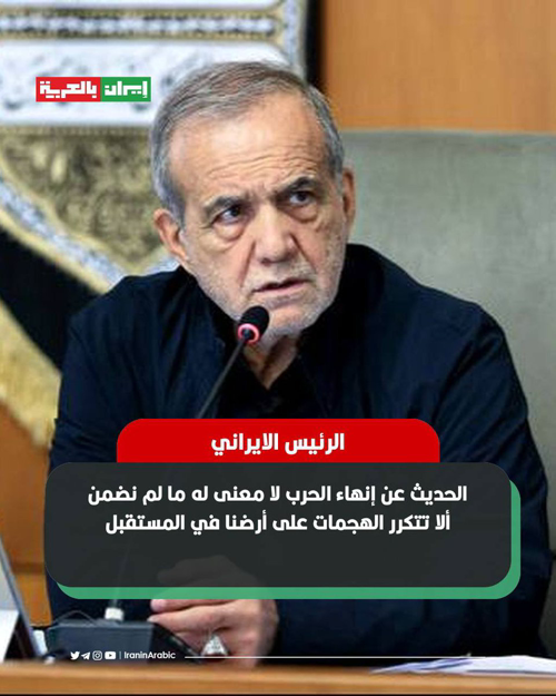 @iraninarabic_ir · 1h الرئيس الايراني مسعود بزشكيان: الحديث عن إنهاء الحرب لا معنى له ما لم نضمن ألا تتكرر الهجمات على أرضنا في المستقبل و إيران لن تستسلم للمتنمرين.
