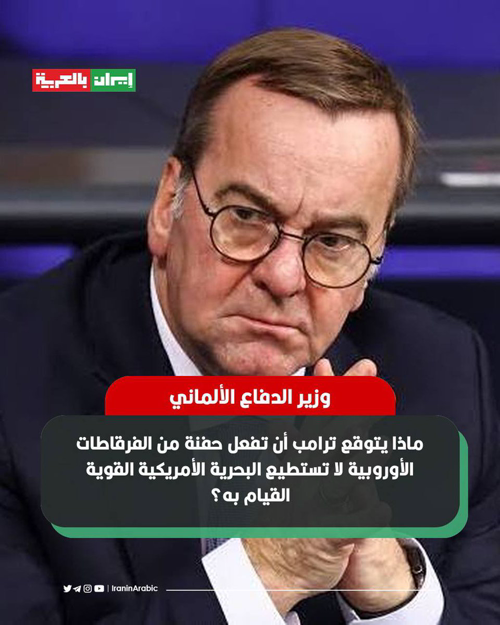 @iraninarabic_ir · 7h 🔺وزير الدفاع الألماني بوريس بيستوريوس: ماذا يتوقع ترامب أن تفعل حفنة من الفرقاطات الأوروبية لا تستطيع البحرية الأمريكية القوية القيام به؟ هذه ليست حربنا، ولم نبدأها.