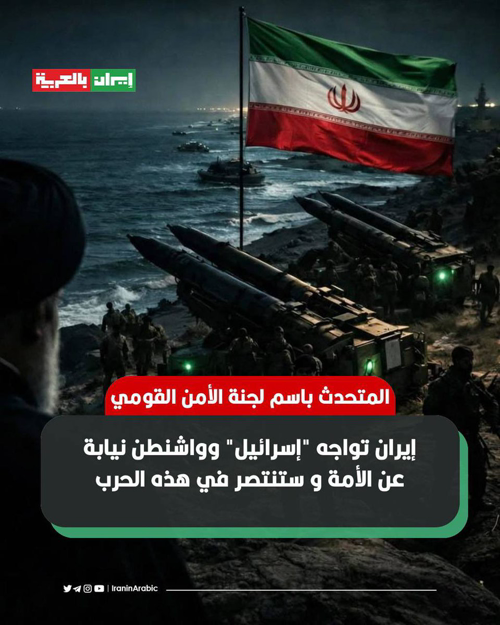 @iraninarabic_ir · 28m 🔺المتحدث باسم لجنة الأمن القومي في البرلمان إبراهيم رضائي: إيران تواجه "إسرائيل" وواشنطن نيابة عن الأمة و ستنتصر في هذه الحرب