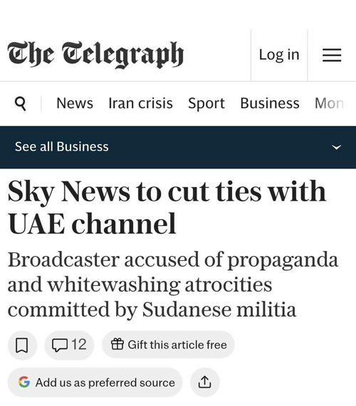 @anesmansory · 2h #سكاي_نيوز تقطع علاقاتها مع قناة سكاي نيوز عربية في أبوظبي. اتهامات لها بالدعاية وتبييض الفظائع التي ارتكبتها ميليشيات سودانية. #السودان