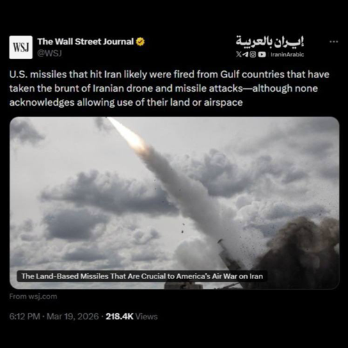 @iraninarabic_ir · 11h وول ستريت جورنال: الصواريخ الأمريكية التي تستهدف إيران تُطلق من أراضي دول الخليج ... ومع ذلك، لا تعترف أي من هذه الدول باستخدام الولايات المتحدة لأراضيها أو مجالها الجوي.