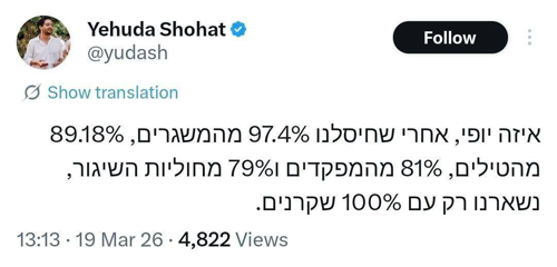 @iraninarabic_ir · 11h تلميح الصحفي الصهيوني إلى إحصائيات عمليات جيش الاحتلال: "ما أروع هذا! بعد أن دمّرنا 97.4% من منصات الإطلاق، و89.18% من الصواريخ، و81% من القادة، و79% من فرق الإطلاق، لم يتبق لدينا سوى 100% كذابون."
