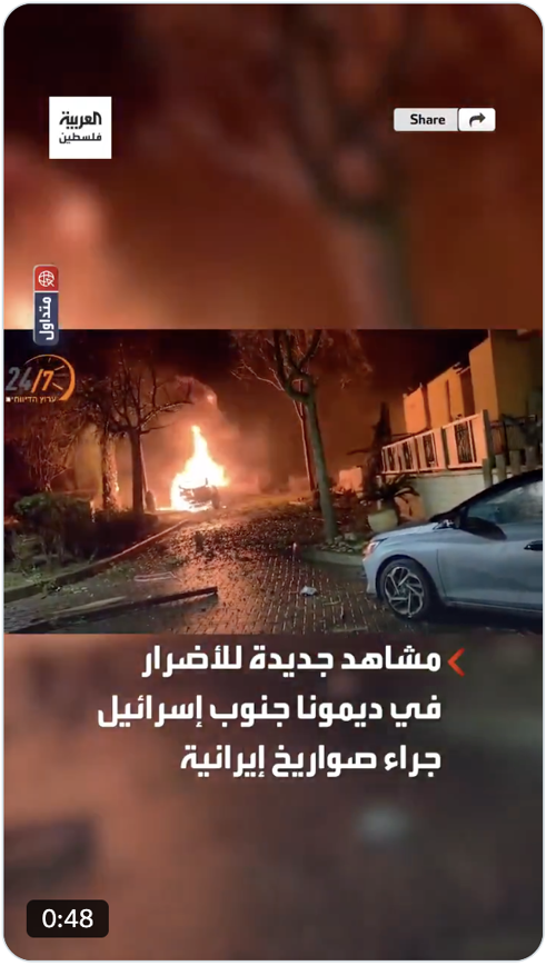 @SHB942 · 23m 🔹حرس الثورة في إيران: استُهدفت المنشآت العسكرية والمراكز الأمنية في "عراد" و"ديمونا" و"إيلات" و"بئر السبع" و"كريات جات" بعد انهيار منظومة الدفاع التابعة لهذا الجيش الصهيوني الغاصب #ديمونا #تل_أبيب_تحترق #Israël