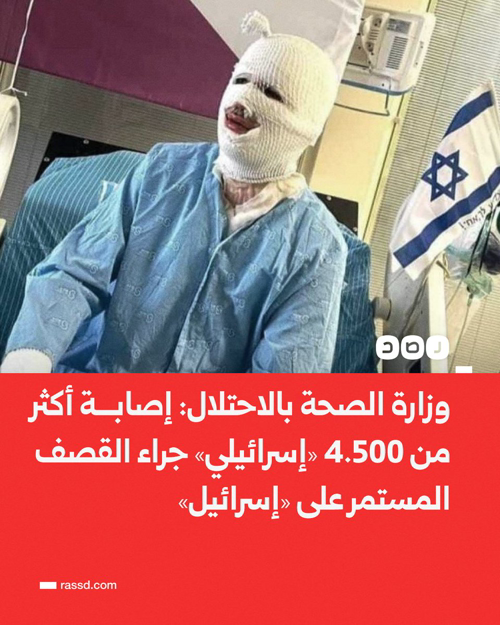 @RassdNewsN · 7h تغطية صحفية | جراء قصف من إيران والحزب في لبنان.. وزارة الصحة بالاحتلال: «إصابة أكثر من 4.500 «إسرائيلي» جراء القصف المستمر على «إسرائيل» منذ بدء الهجوم على إيران»