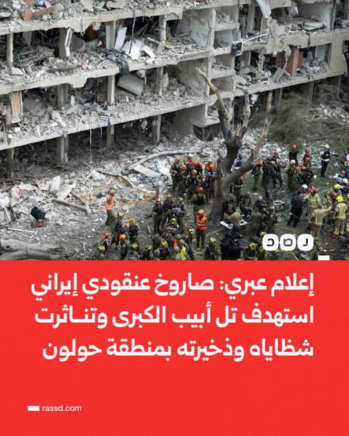 @RassdNewsN · 12h تغطية صحفية | إعلام عبري: صاروخ عنقودي إيراني استهدف تل أبيب الكبرى وتناثرت شظاياه وذخيرته في منطقة حولون