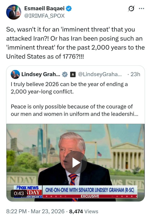 @IranArabic_ir «تهديد وشيك» عمره ألفا عام من إيران ضد أمريكا؟! ردّ إسماعيل بقائي، المتحدث باسم وزارة الخارجية الإيرانية، على تصريحات ليندسي غراهام التي قال فيها إن عام 2026 قد يكون فرصة لحل نزاع عمره 2000 عام، وذلك في منشور على منصة إكس: «ألم تقولوا إن سبب الهجوم على إيران هو درء “تهديد وشيك”؟! أم أن هذا “الخطر الوشيك” مستمر منذ 2000 عام ضد الولايات المتحدة التي تأسست عام 1776؟!