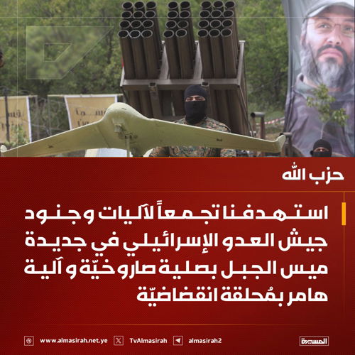 @TvAlmasirah · 1h ⭕️عاجل⭕️ حزب الله: استهدفنا تجمعاً لآليات وجنود جيش العدو الإسرائيلي في جديدة ميس الجبل بصلية صاروخيّة و آلية هامر بمُحلقة انقضاضيّة