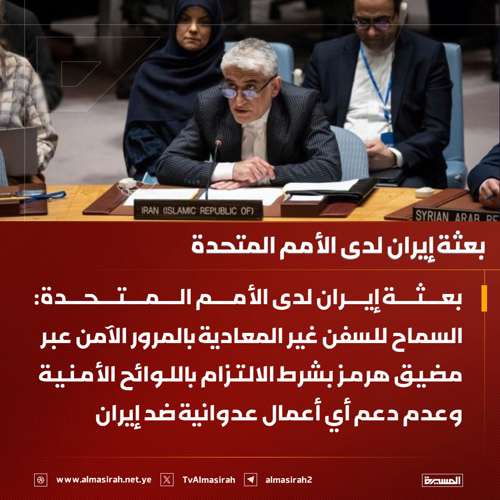 @TvAlmasirah 🟥 بعثة إيران لدى الأمم المتحدة: ♦️ السماح للسفن غير المعادية بالمرور الآمن عبر مضيق هرمز بشرط الالتزام باللوائح الأمنية وعدم دعم أي أعمال عدوانية ضد #إيران ♦️ عبور السفن غير المعادية والملتزمة عبر مضيق هرمز يتم بالتنسيق مع السلطات الإيرانية المختصة لضمان السلامة والأمن في المضيق