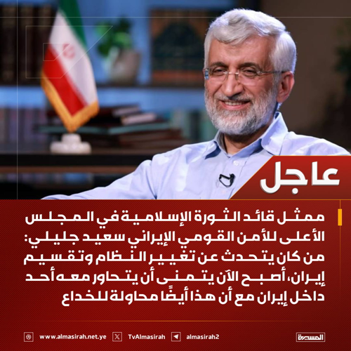 @Nasr_Amer1 · 5h عاجل ممثل قائد الثورة الإسلامية في المجلس الأعلى للأمن القومي الإيراني سعيد جليلي: من كان يتحدث عن تغيير النظام وتقسيم إيران، أصبح الآن يتمنى أن يتحاور معه أحد داخل إيران مع أن هذا أيضًا محاولة للخداع