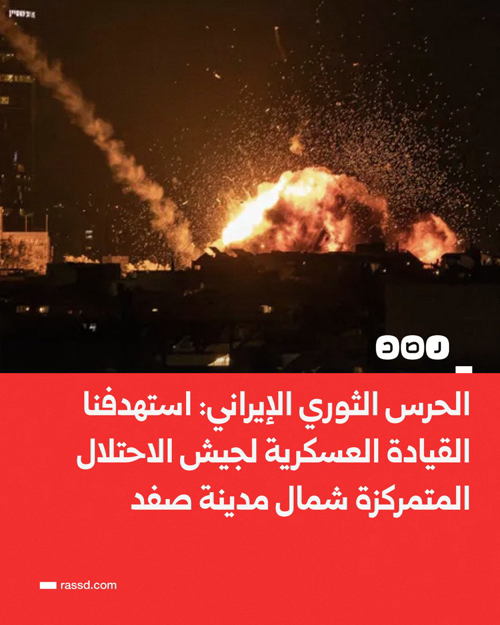 @RassdNewsN · 31m تغطية صحفية| الحرس الثوري الإيراني: استهدفنا القيادة العسكرية لجيش الاحتلال المتمركزة شمال مدينة صفد، وهذه العمليات هي بداية لاستهداف أماكن تجمع القوات الصهيونية في شمال فلسطين وحزام غزة