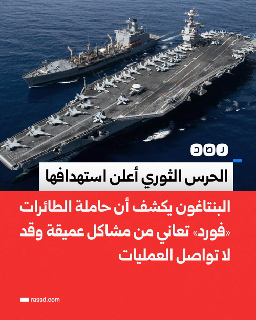 @RassdNewsN تغطية صحفية| بلومبرغ عن تقرير للبنتاغون: حاملة الطائرات «فورد» تعاني من مشاكل أعمق بكثير من تأثيرات حريق في غرفة غسيل الملابس، وأن استمرارها في العمليات قد لا يكون مضمونا في حال تعرضها لنيران العدو، فيما كان الحرس الثوري قد أعلن استهدافها خلال الحرب. وتُعد حاملة الطائرات «فورد» من أحدث حاملات الطائرات في الأسطول الأميركي، وتستخدمها الولايات المتحدة في تنفيذ العمليات العسكرية الجوية حول العالم.